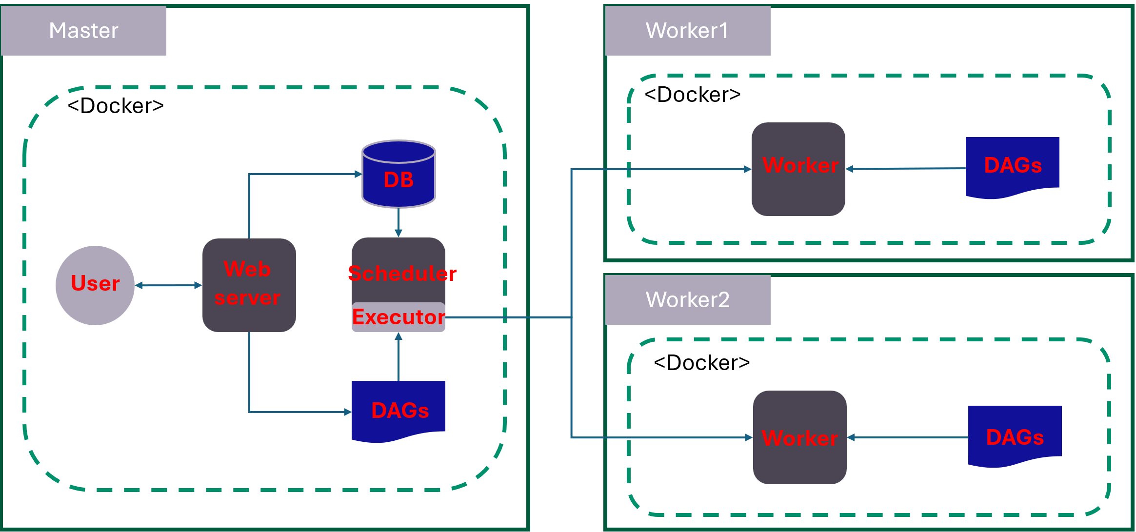 위 그림에서 보면 Master, worker1, 그리고 worker2로 Node가 3개가 있습니다. 3개의 노드를 만들고 그 위에 Airflow의 요소들을 배치할 것입니다. 각각의 노드에는 아래와 같은 컴포넌트가 있습니다.