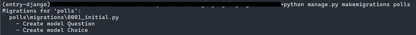 처음 보는 명령입니다. makemigrations 명령어는 migrate 명령어와 유사한 기능을 합니다. 다만, 특정한 앱, 지금은 polls 앱에 대한 변경사항만 확인하는 명령입니다. 명령을 수행하면 아래와 같은 화면을 확인할 수 있습니다.
