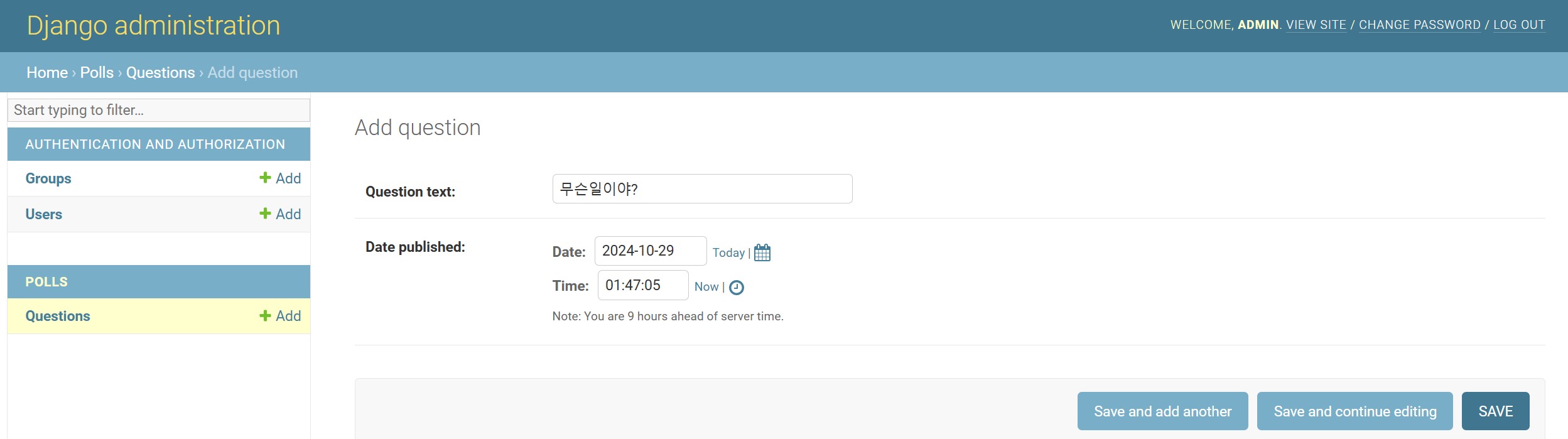 - 우리가 만든 모델인 Question과 Choice 객체에 접근할 수 있도록 Python API를 만들어 줍니다.