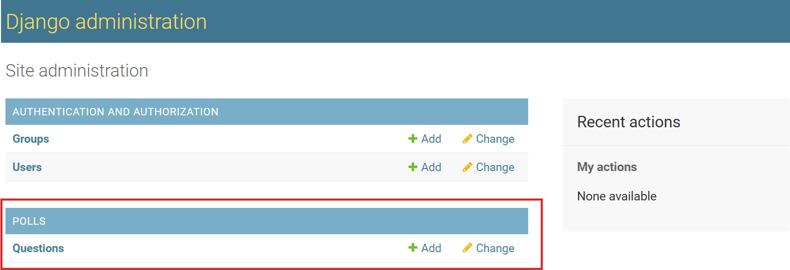 그런데 이상하죠. 저희가 만든 Polls 앱이 보이지 않습니다. 관리자 페이지에서 Polls App을 보이게 하려면 admin에 등록을 하는 과정을 거쳐야 합니다. polls/admin.py 파일을 수정해 봅시다.