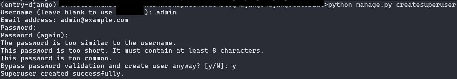 관리자 계정 생성 역시 manage.py의 명령어를 통해 만듭니다.