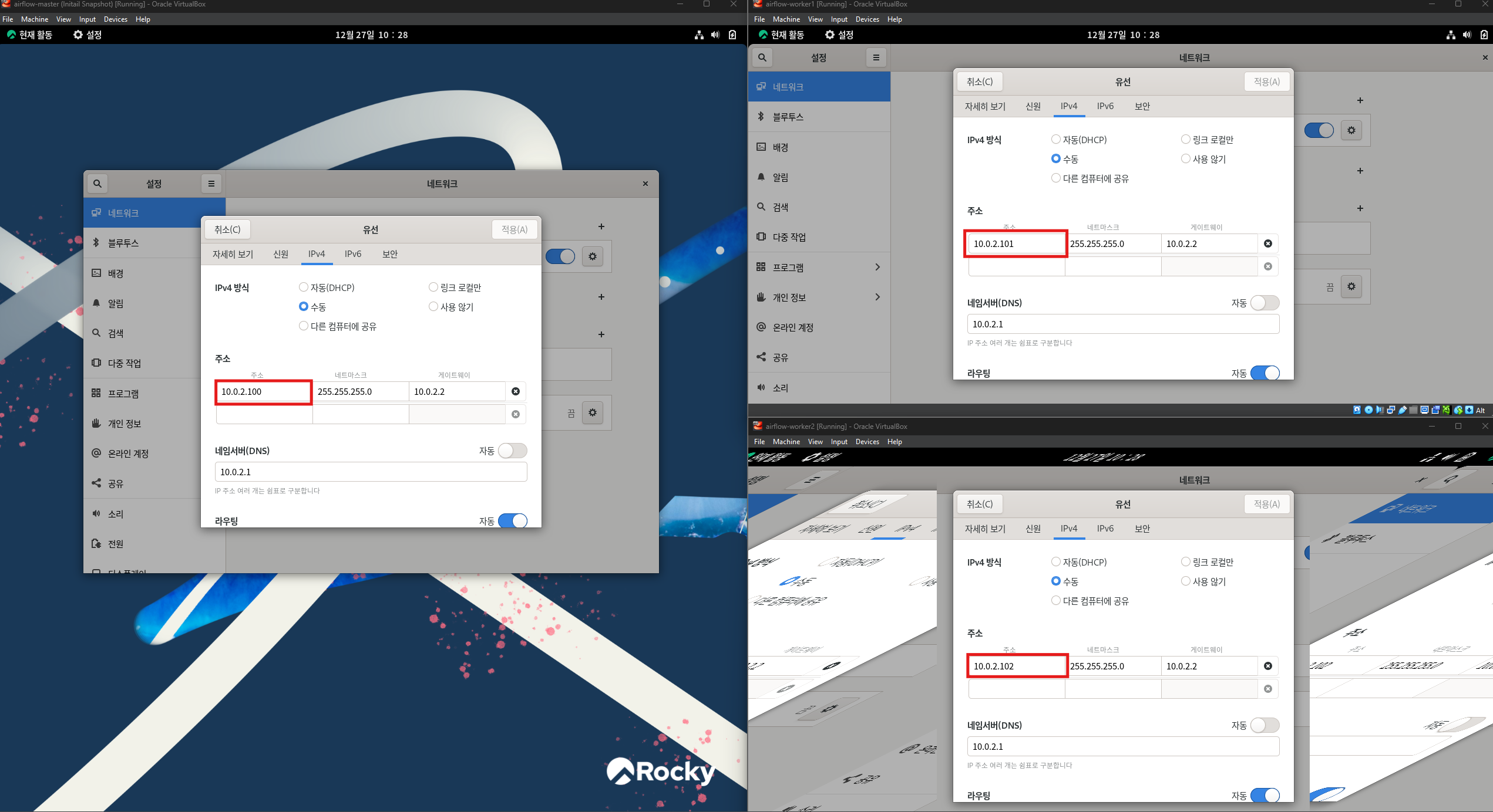 각 가상머신의 네트워크 설정에서 IP를 수동으로 지정합니다.