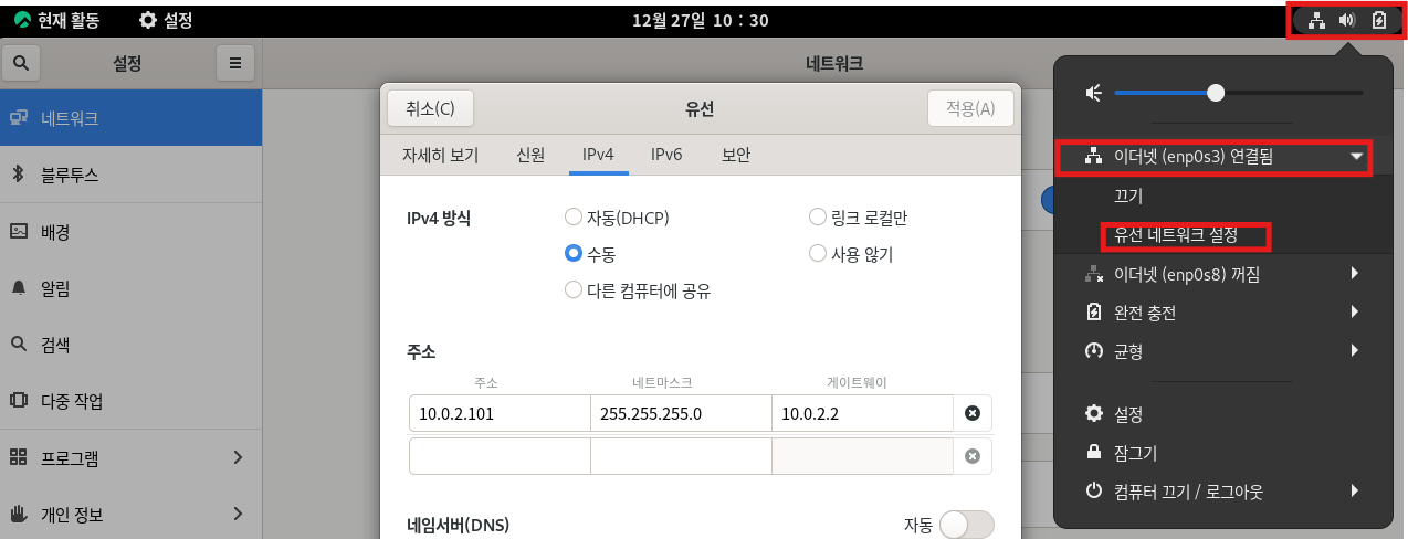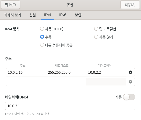 설정 저장 후 네트워크를 한 번 비활성화했다가 다시 활성화하여 확실히 적용합니다.